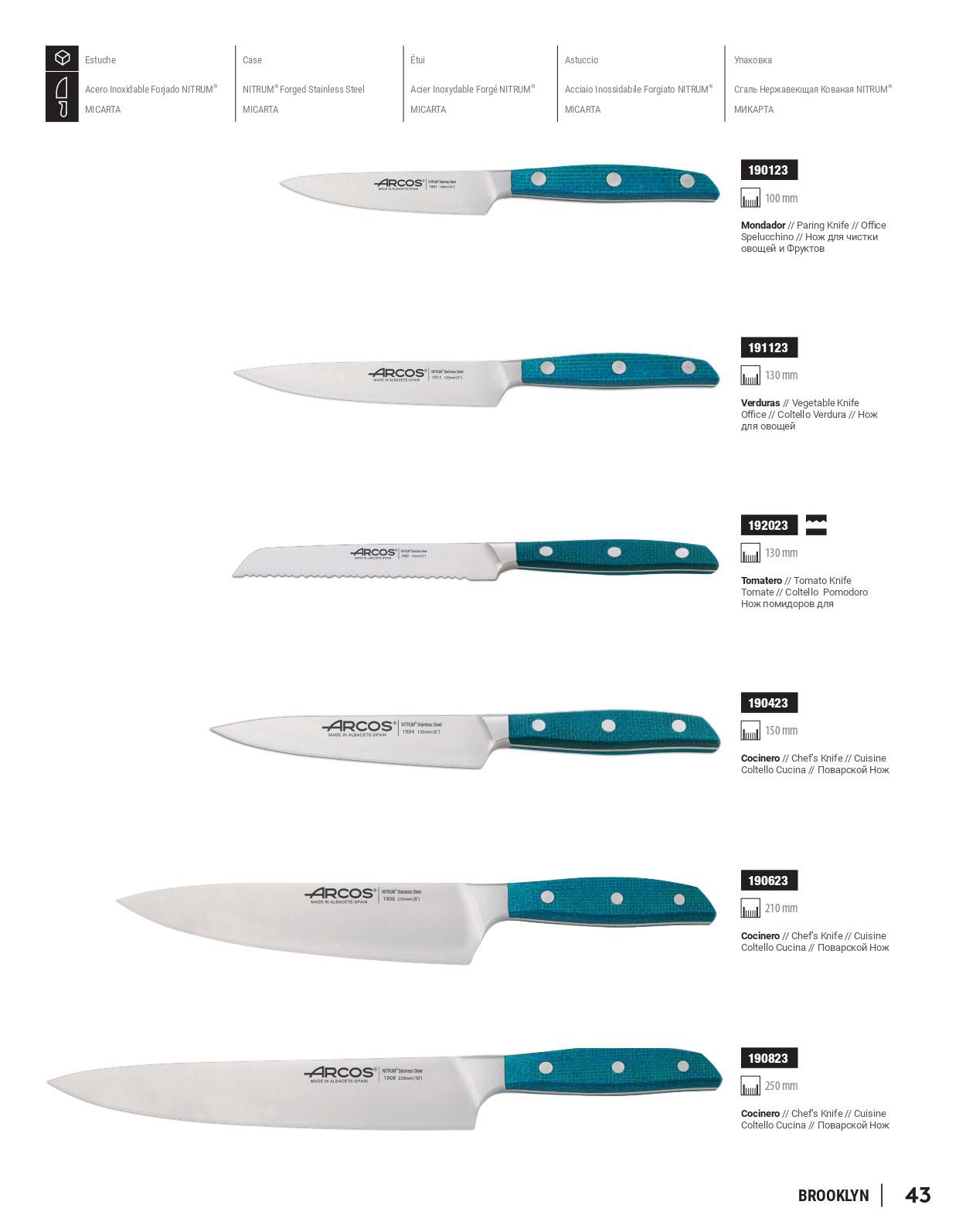 | Brooklyn | Forjada de alta gama de acero inoxidable NITRUM®, con Filo Seda | Micarta (tela prensada con resina) en tonos azulados. Remaches de acero inoxidable. | Balance perfecto, máxima durabilidad y corte preciso. Resistencia a temperaturas elevadas y humedad ambiental. Recazo redondeado y media virola que facilita el corte y afilado. | Chefs profesionales y cocineros muy exigentes. | Diseño que combina fortaleza y comodidad, con un característico color de mango azulado. |