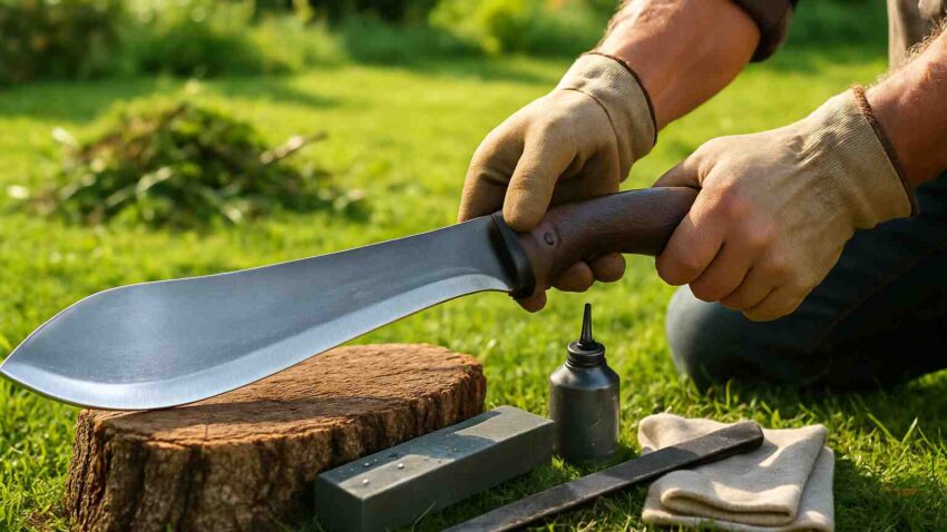 El mantenimiento efectivo incluye cinco prácticas esenciales: limpieza inmediata después de cada uso para eliminar savia, tierra y humedad con un paño seco; afilado regular usando piedra de afilar o lima manteniendo el ángulo de bisel original (20-30°), idealmente después de cada jornada intensiva o mensualmente para uso ocasional; aplicación de aceite protector en toda la hoja después de limpiar y secar, usando aceite mineral, aceite de camelia o grasa de litio para almacenamiento prolongado; almacenamiento adecuado en lugar seco y ventilado, siempre dentro de la funda protectora, evitando contacto con el suelo o humedad; y revisión periódica del mango y la unión con la hoja para detectar desgaste o daños. Estos cuidados previenen la oxidación (especialmente crítica en acero al carbono), mantienen el filo óptimo, evitan deformaciones y aseguran que el machete esté listo y seguro cada vez que lo necesites.